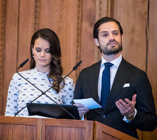 | Princess Sofia of Sweden stood by her husband side Prince Carl Philip of Sweden, as he said a few words from the podium for their charity foundation at the Royal Palace in Stockholm |