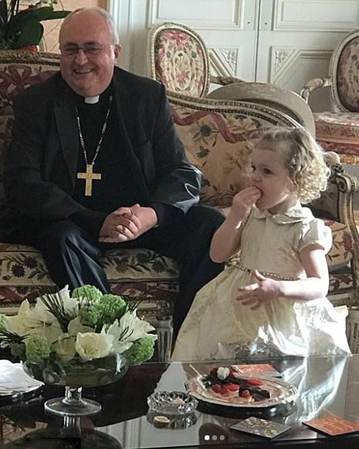 | The young Princess Gabriella of Monaco having a snack and a morning tea with Monsignor Barsi, the Archbishop of Monaco during a morning visit on November 18, 2017 |
